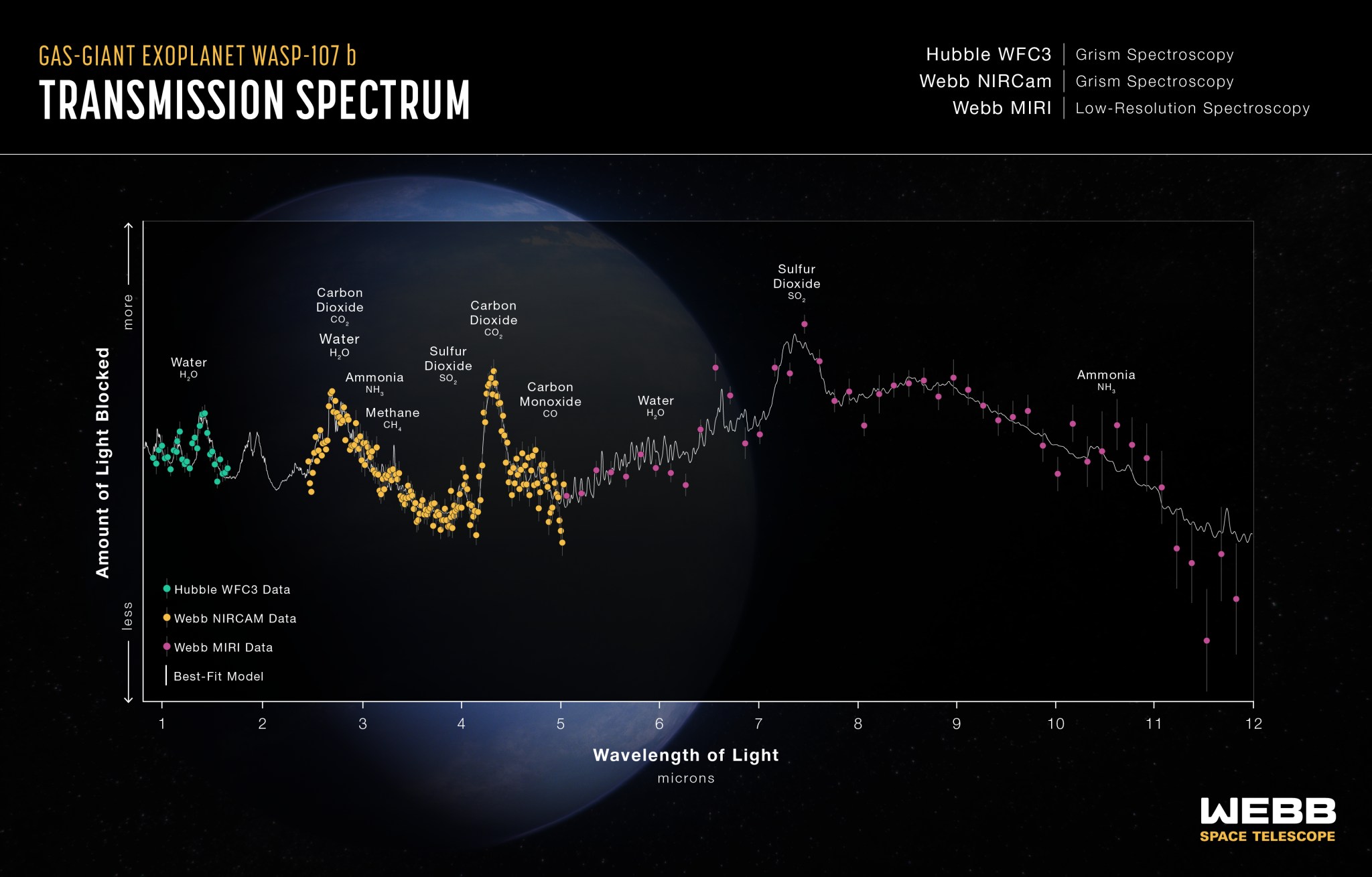 Forskerne er kommet langt når det gjelder  å forstå klimagasser på jorda. Men de samme modellene kan også brukes når man går lenger ut i universet. Den strålingen vi observerer fra stjernene oppfører seg slik som på jorda når de møter gasser i atmosfæren til planeter som går rundt dem. (eksoplaneter). Man er i ferd med å kartlegge i overkant av 5000 slike planeter nå, og de ligger i umiddelbar nærhet til jorda. Bildet under viser transmissionsspekteret til planeten WASP-107 bDenne planeten er 211 lysår fra jorda og har både vann, CO2 og SO2 i atmosfæren og ligner mye på vår atmosfære. Disse gassene absorberer IR-stråling fra stjernen i planetens nærhet på de samme bølgelengder som på jorda. Webb-teleskopet klarer å kartlegge nøyaktig hvordan lyset fra stjernen 'filtreres' av sin eksoplanet.
