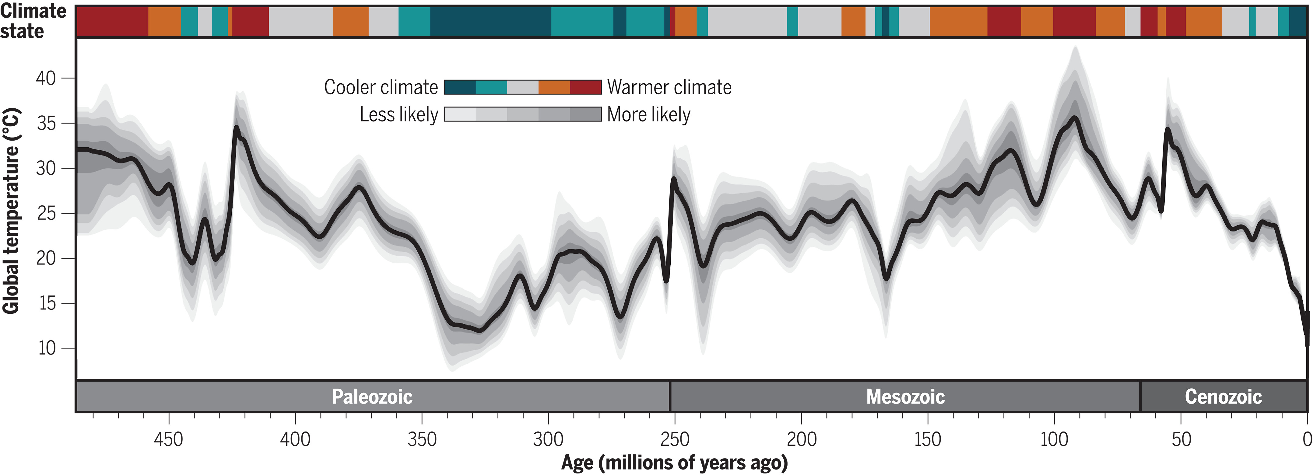 Jorda har vært varm før. For 200 millioner år siden (i Perm-Trias) var den 11C varmere enn i dag. I den 4. kvadranten i grafen ser vi istider der det skifter mellom -5C og 0C. 5 kvadrant viser vår mellomistid (Holocen). Grafen er en form for logaritmisk. 5 kv. viser 20.000 år, mens 1.kv. viser 500 millioner år.