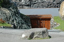Ved Moster Amfi står en stein, som Kong Olav V, Kong Harald V og Dronning Sonja har risset navnene sine inn i.