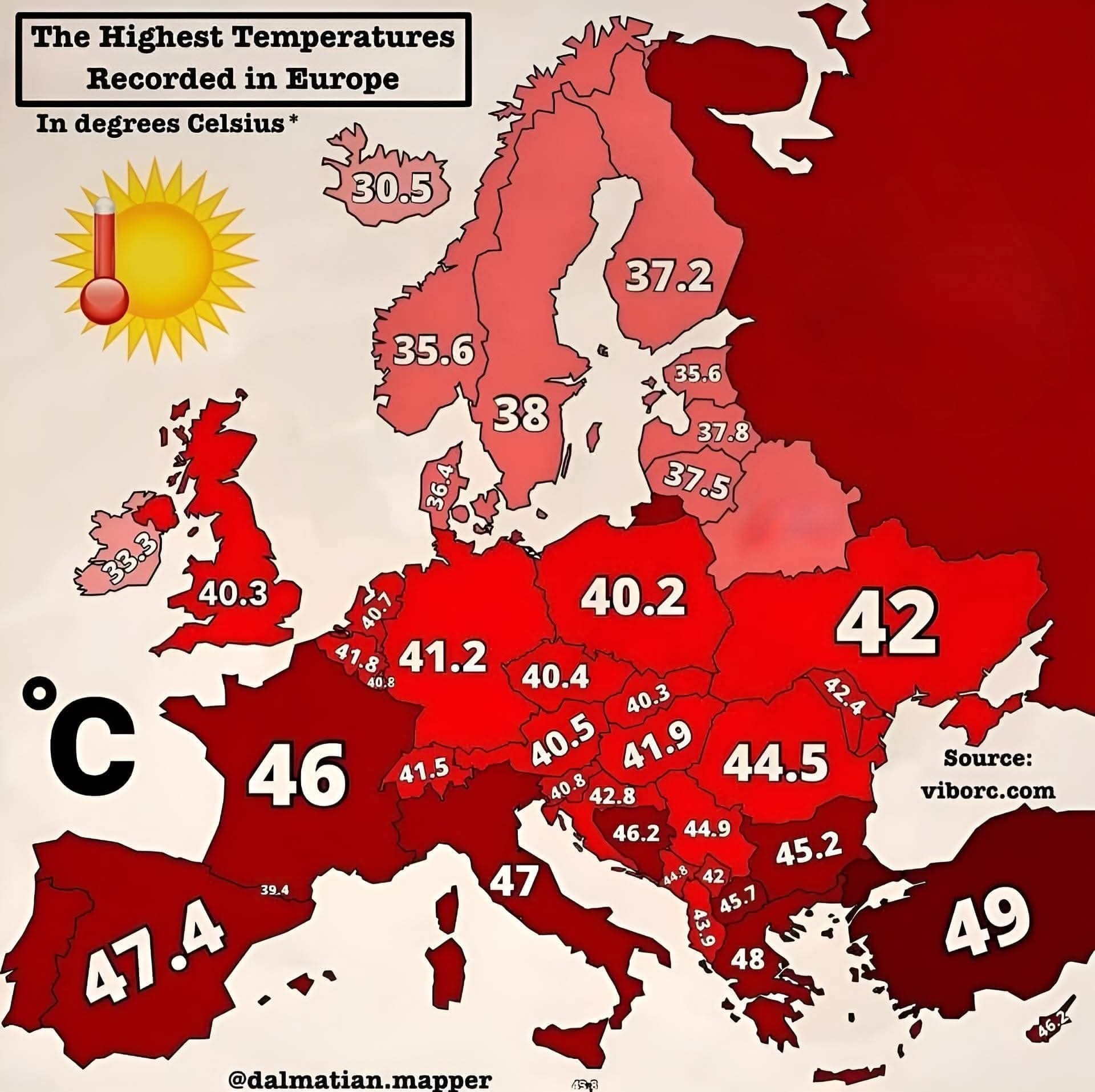 • Varmerekorden i Europa ble registrert på Sicilia – den er på 48.8 grader.
