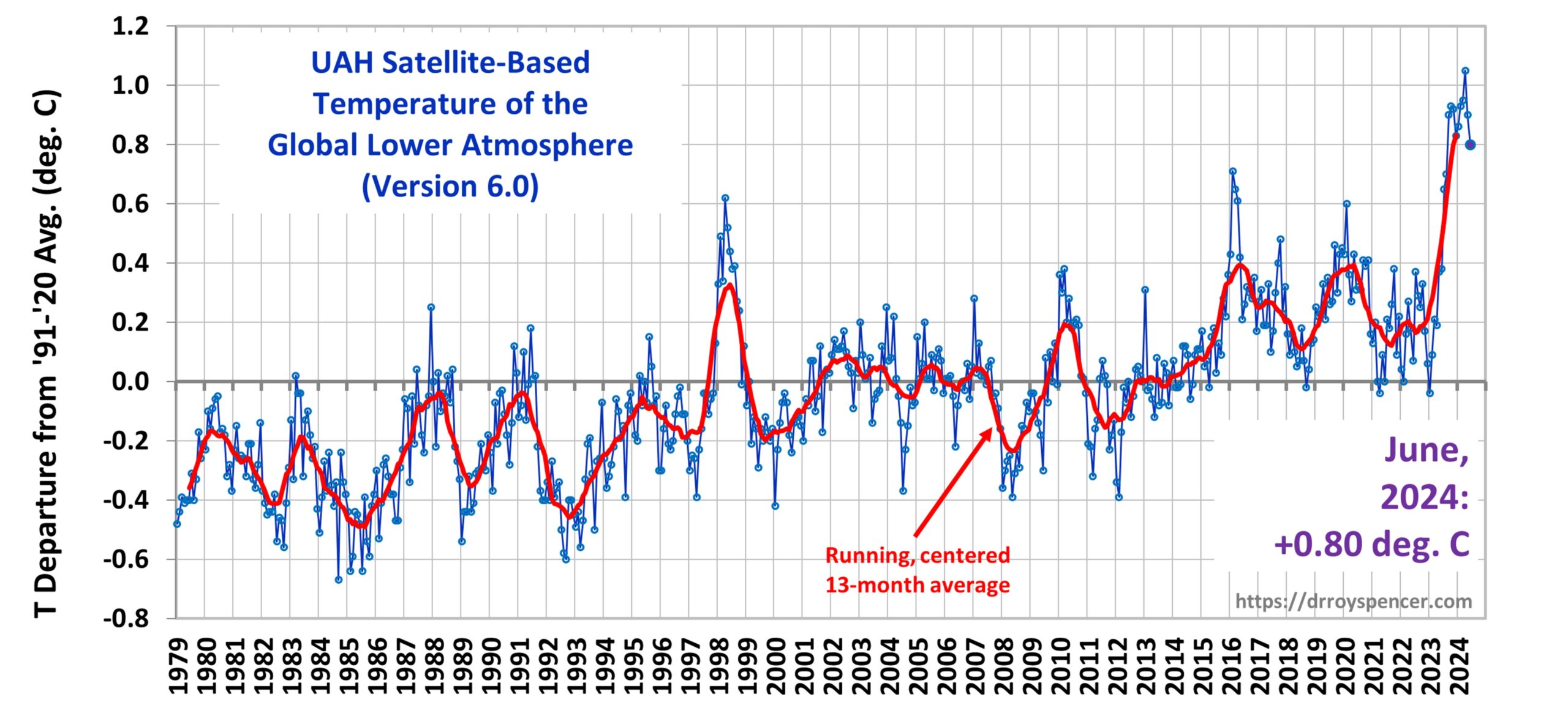 Vurdering i 2024: At temperaturen i Troposfæren holder seg oppe på tross av at El Nino nå er over, er overraskende. Samtidig må vi huske at Troposfæren varmes opp indirekte. Dette er litt komplisert å forklare. For noen år tilbake trodde forskerne at atmosfæren ble varmet opp av ved at IR-(varme) stråler ble 'fanget' i CO2 (og gassen ble varmet opp) . I så tilfelle ville Troposfæren kokt nå. Drivhuseffekten virker på en annen måte. Nå er temperatur i Troposfæren 0.96C over  30 års normalperiode 1991-2020, opp fra 0.80C i juni.