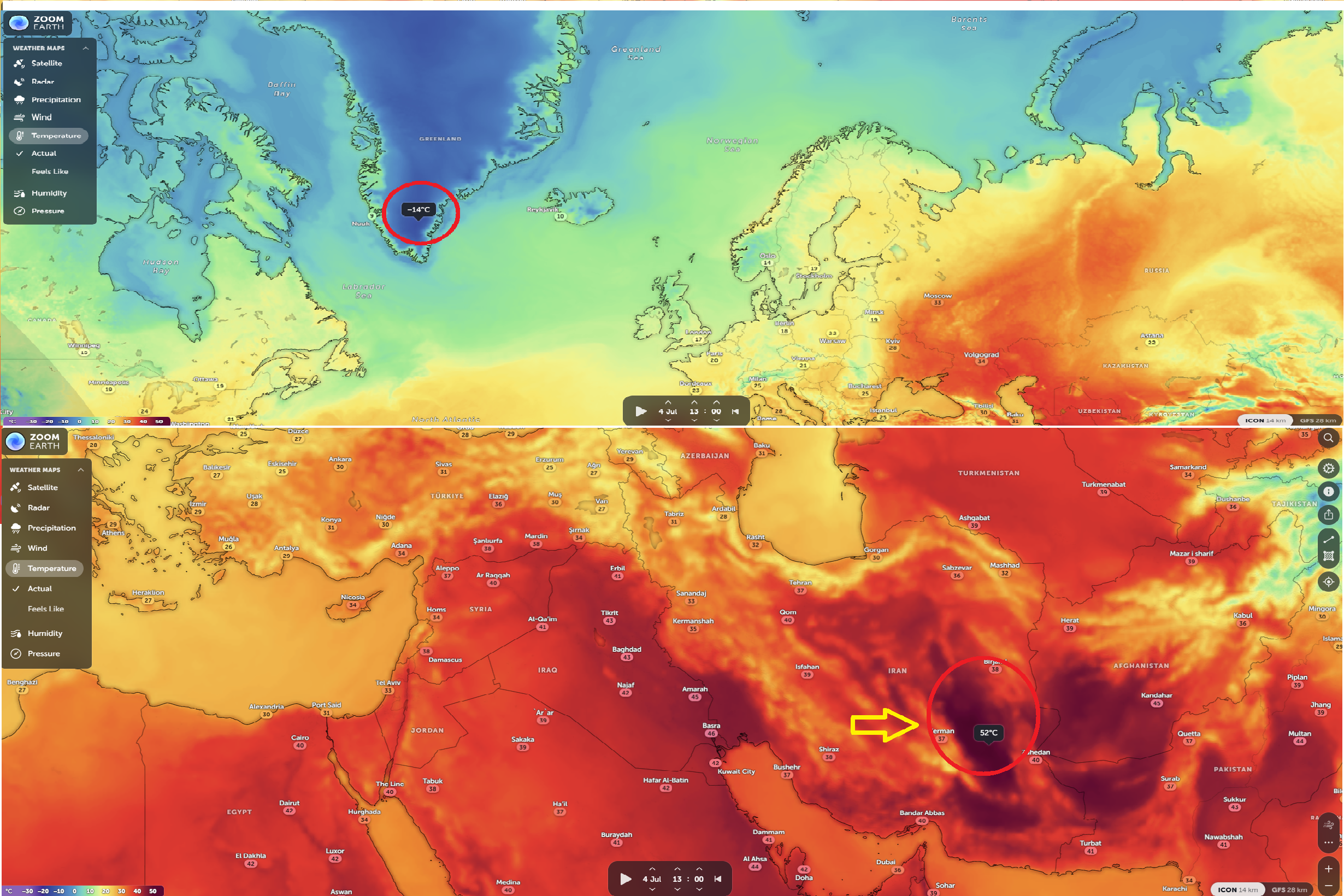 4.juli 2024: -14C sør-grønland * +53C øst-iran