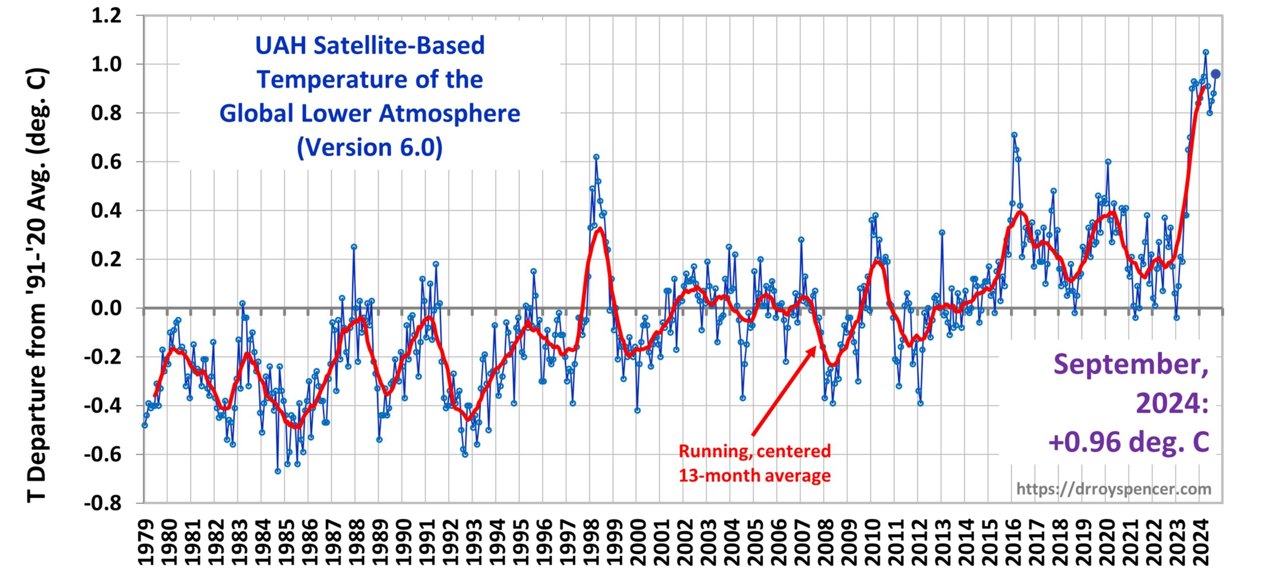 desember 2023 var +0,83 grader C opp fra gjennomsnittet for 1991-2020, ned fra avviket i november 2023 på +0,91 grader C. Den årlige gjennomsnittlige globale LT-anomalien for 2023 var +0,51 grader C over gjennomsnittet for 1991-2020, noe som enkelt gjør 2023 til det varmeste på 45-års satellittmålinger. Det neste varmeste året var 2016 med +0,39 grader opp.