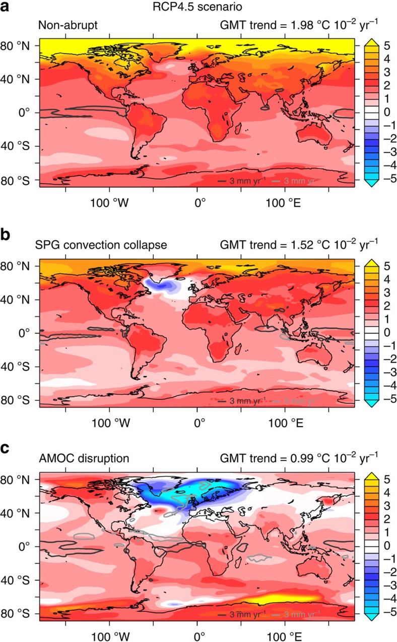 En kollaps av de varme havstrømmene i Atlanterhavet har allerede kjølt ned deler av Atlanterhavet sør-øst for Grønland. Tanken om nedkjøling har blitt en del av folketroen gjennom filmen 'The day after Tomorrow'. Men nå mener en del forskere at en hendelse som alltid har skjedd ved overgangen fra istid til mellomistid kan skje igjen. Og nå er det ikke mye is i nord som i en istid. Dermed kan det bli svært varmt på kort tid.